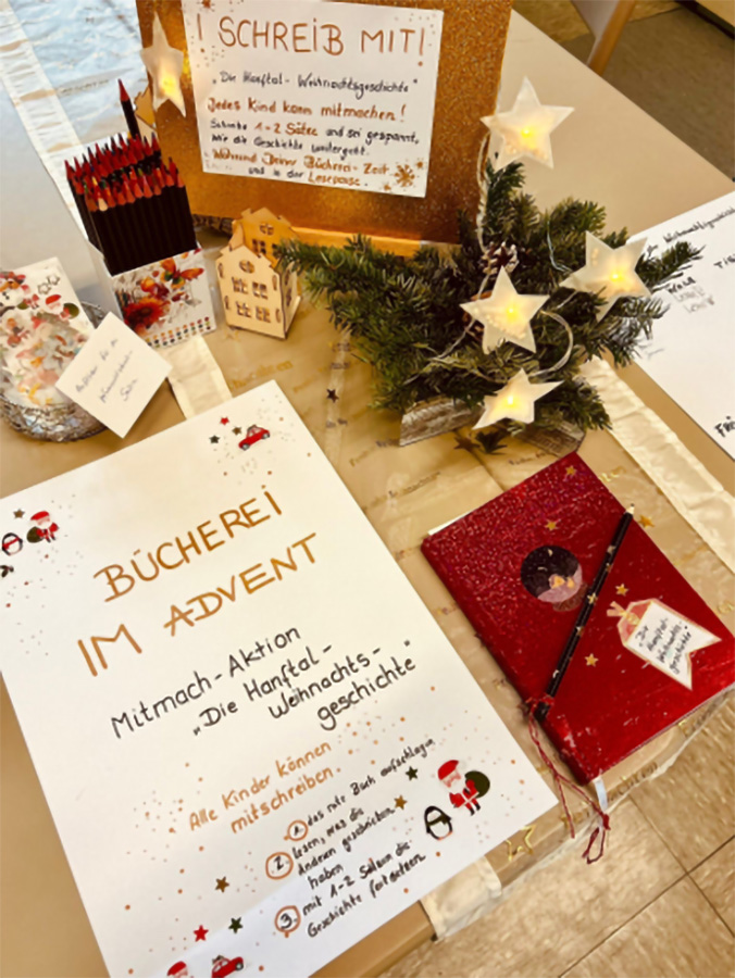 In der Adventszeit entsteht in unserer Bücherei eine „Hanftal-Weihnachtsgeschichte“. Jedes Kind kann in der Bücherei-Zeit oder in der Lesepause 1-2 Sätze dazu schreiben, so dass am Schl...